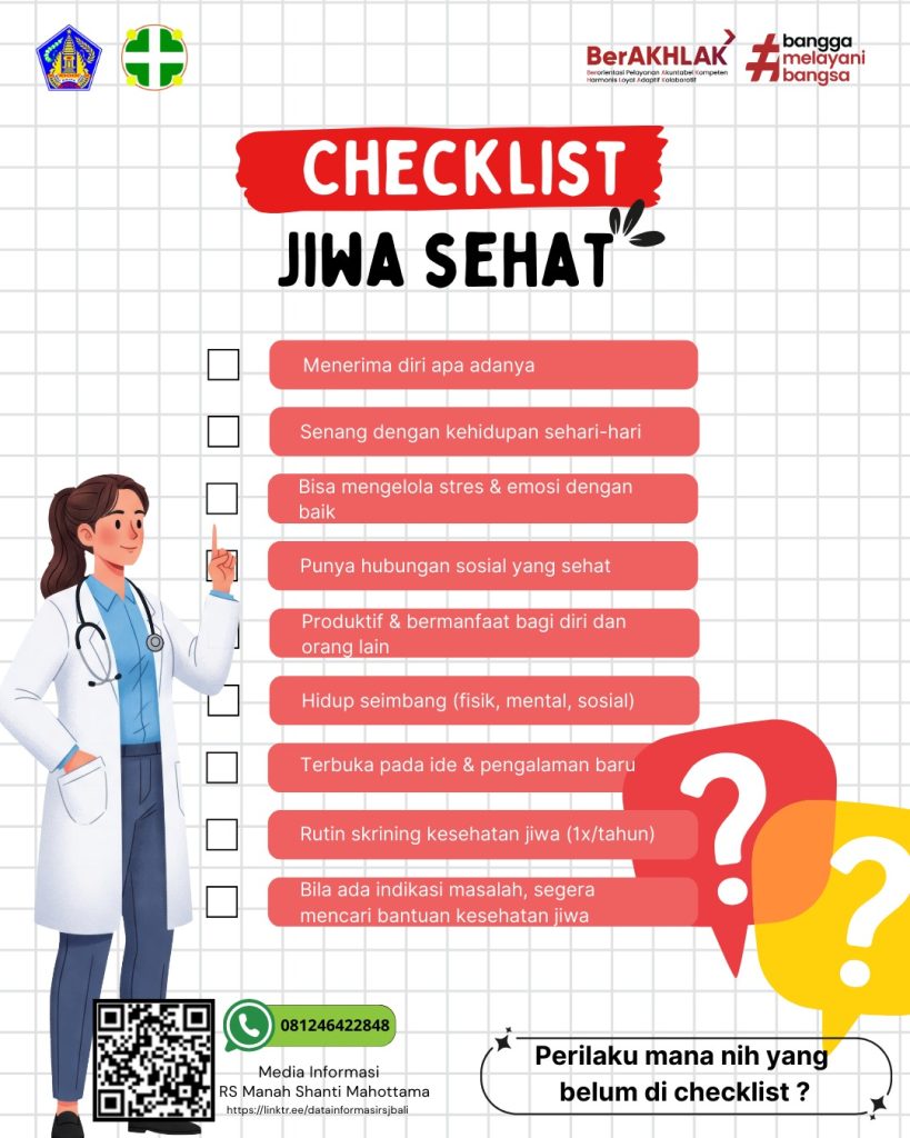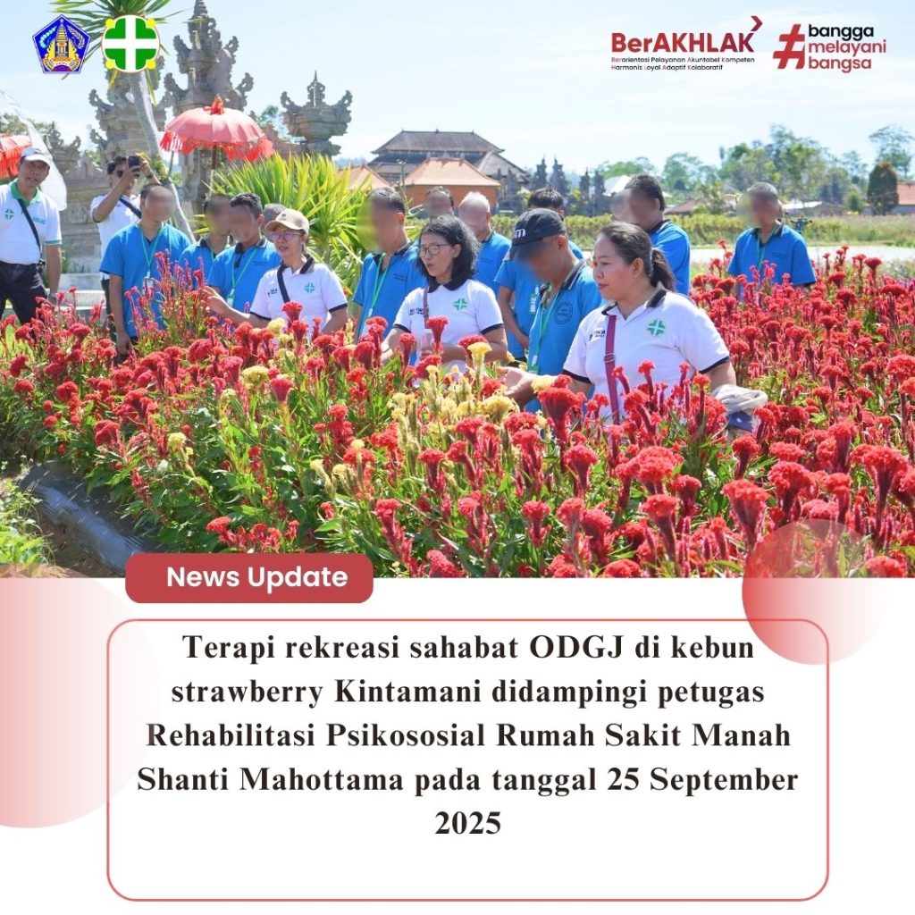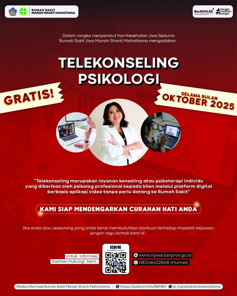Berita Selamat Hari Kesehatan Jiwa Sedunia Tahun 2025 Selamat Hari Kesehatan Jiwa Sedunia Tahun 2025 Tahun ini kita mengusung tema “Akses Layanan Kesehatan Jiwa dalam Situasi Bencana dan Telekonseling Langkah pertama menuju pulih adalah berani bercerita Dalam rangka Hari Kesehatan Jiwa Sedunia, Rumah Sakit Manah Shanti Mahottama mengadakan Telekonseling Seminar Service Excellent Pada hari Jumat, 3 Oktober 2025, bertempat di Gedung Diklat Rumah Sakit Jiwa Manah Shanti Mahottama, telah diselenggarakan kegiatan Seminar Pentingnya sehat jiwa dalam segala situasi Kadang luka yang paling dalam tidak terlihat oleh mata. Andi kehilangan rumahnya karena banjir, dan hampir kehilangan harapannya juga. Tapi Hallo sahabat RSMSM Hallo sahabat RSMSM Pada hari Selasa 30 September 2025 di RS Manah Shanti Mahottama telah melaksanakan kegiatan bank sampah Kami SELAMAT MEMPERINGATI HARI KESAKTIAN PANCASILA Hari Kesaktian Pancasila Rumah Sakit Jiwa Manah Shanti Mahottama menyelenggarakan upacara peringatan Hari Kesaktian Pancasila pada tanggal 1 Oktober 2025, bertempat di halaman Rekreasi Wisata Ke Kebun Strowberi Rekreasi Wisata Kebun Strowberi bersama Sahabat ODGJ RSJMSM Halo Sahabat RSJMSM Tahukah kamu, rekreasi bukan hanya soal bersenang-senang, tapi juga World Clean Up Day 2025 World Clean Up Day 2025 Dalam rangka memperingati World Clean Up Day, keluarga besar Rumah Sakit Jiwa Manah Shanti Mahottama Cek Yuk, Jiwa Kamu Sehat atau Tidak! Cek Yuk, Jiwa Kamu Sehat atau Tidak! Halo Sahabat Jiwa, menjaga kesehatan jiwa sama pentingnya dengan menjaga kesehatan fisik Menerima diri apa « Previous 1 … 9 10 11 12 13 … 124 Next »