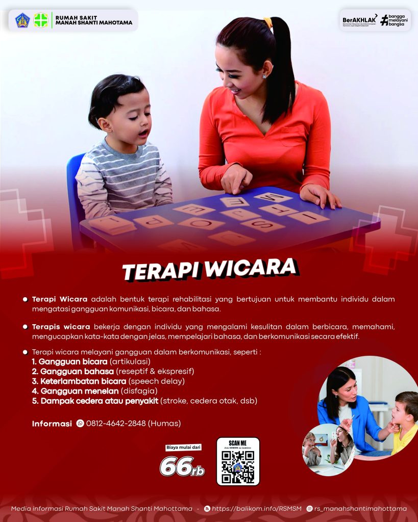 Hallo Sahabat RSMSM Kami menghadirkan layanan Terapi Wicara, baik untuk anak-anak maupun dewasa dengan keluhan Gangguan Bicara, Bahasa, Keterlambatan Bicara,