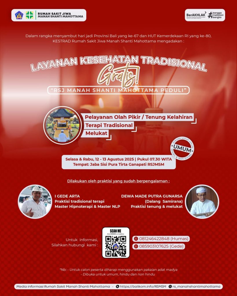 Berita Halo Sahabat RSMSM Halo Sahabat RSMSM Tidak semua anak bisa mengekspresikan perasaannya dengan mudah. Di balik senyum dan tingkah laku yang tampak normal, LAYANAN KESEHATAN TRADISIONAL Dalam Rangka Hari jadi Provinsi Bali ke-67 dan HUT Kemerdekaan RI ke-80 Rumah Sakit Jiwa Manah Shanti Mahottama menyelengarakan:LAYANAN KESEHATAN Edukasi kesehatan jiwa Senin 21 Juli 2025, Tim PKRS dan Keswamas bersama dengan Psikolog Rumah Sakit Jiwa Manah Shanti Mahottama memberikan edukasi kesehatan Kegiatan edukasi Kegiatan edukasi di beberapa sekolah di Kabupaten Bangli dalam rangka MPLS (Masa Pengenalan Lingkungan Sekolah) oleh Tim PKRS dan Keswamas Halo Sahabat RSMSM! Halo Sahabat RSMSM! Yuk, kenali batas antara bercanda dan bullying. Tidak semua yang kita anggap lucu bisa diterima dengan tawa Piodalan di Pura Tirta Ganapati Suasana khidmat dan penuh makna menyelimuti pelaksanaan piodalan di Pura Tirta Ganapati, yang berada di lingkungan Rumah Sakit Manah Shanti Tim Promosi Kesehatan Rumah Sakit (PKRS) RSJ Manah Shanti Mahottama bersama mahasiswa Fakultas Kedokteran Universitas Islam Al-Azhar (UNIZAR) Tim Promosi Kesehatan Rumah Sakit (PKRS) RSJ Manah Shanti Mahottama bersama mahasiswa Fakultas Kedokteran Universitas Islam Al-Azhar (UNIZAR) melaksanakan kegiatan penyuluhan Gangguan jiwa bukanlah “kegilaan” Halo Sahabat RSMSM Gangguan jiwa bukanlah "kegilaan", tapi kondisi kesehatan mental yang bisa dipulihkan. Stigma justru membuat mereka yang butuh Konsultasi terkait perkembangan dan pengobatan salah satu pasien di wilayah kerja Puskesma Nusa Penida 3 Pada hari Rabu, 16 Juli 2025 telah dilaksanakan konsultasi terkait perkembangan dan pengobatan salah satu pasien di wilayah kerja Puskesma Forum Konsultasi Publik Pengembangan Layanan Rehabilitasi Napza Selasa, 15 Juli 2025 | Bangli – Rumah Sakit Manah Shanti Mahottama menyelenggarakan Forum Konsultasi Publik Pengembangan Layanan Rehabilitasi Napza « Previous 1 … 13 14 15 16 17 … 124 Next »