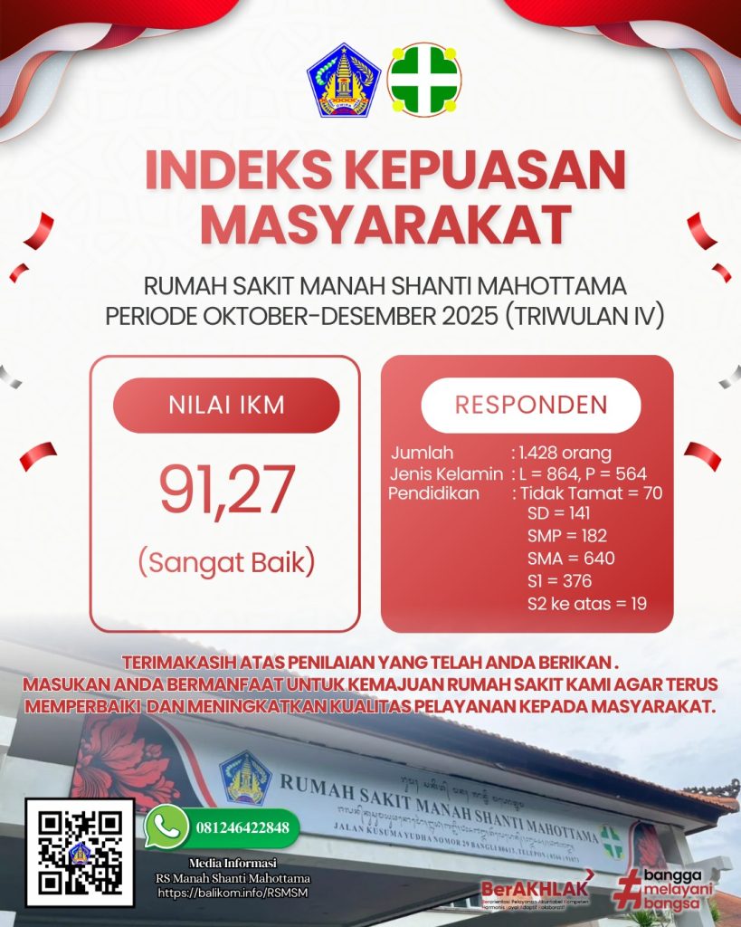 Indeks Kepuasan Masyarakat Triwulan IV 2025 Rumah Sakit Manah Shanti Mahottama Terima kasih atas kepercayaan dan partisipasi seluruh masyarakat Berdasarkan