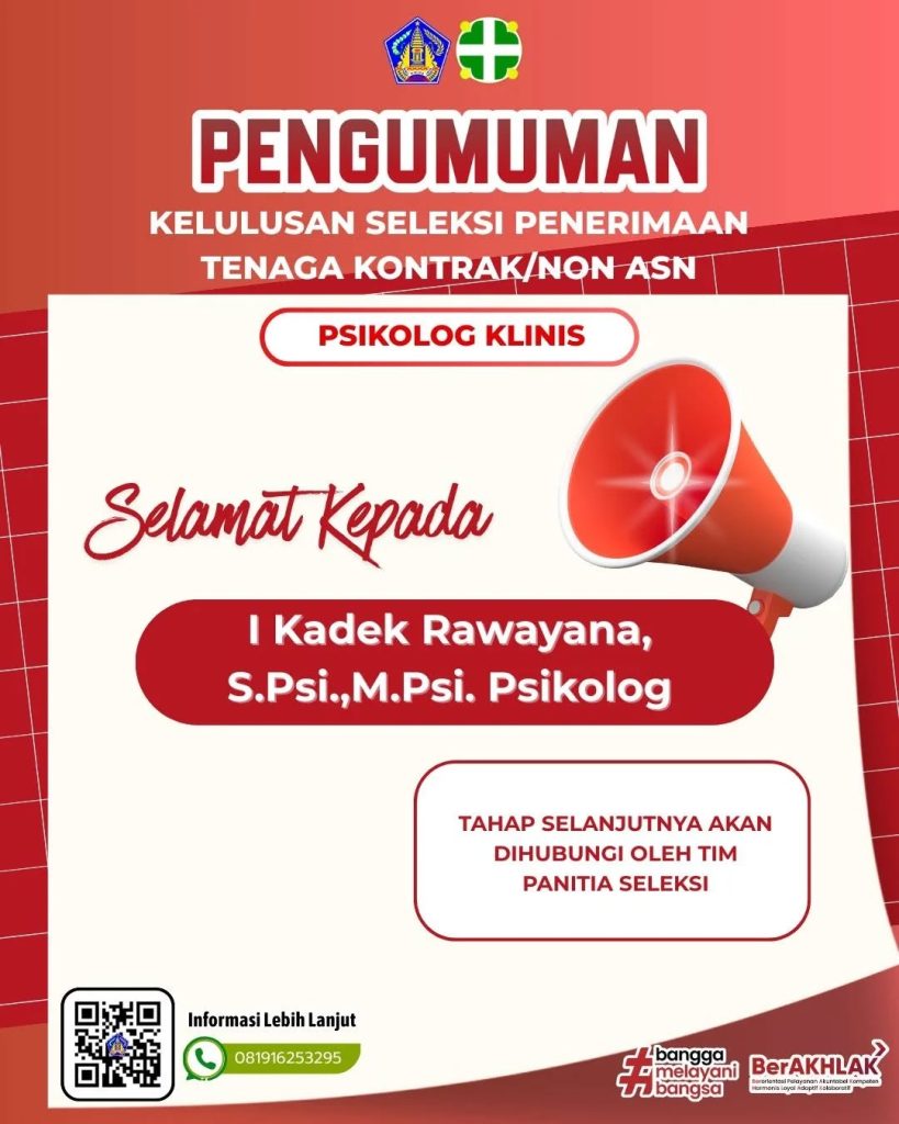 Selamat kepada I Kadek Rawayana, S.Psi., M.Psi., Psikolog atas kelulusannya dalam Seleksi Penerimaan Tenaga Kontrak/Non ASN sebagai Psikolog Klinis.Semoga amanah