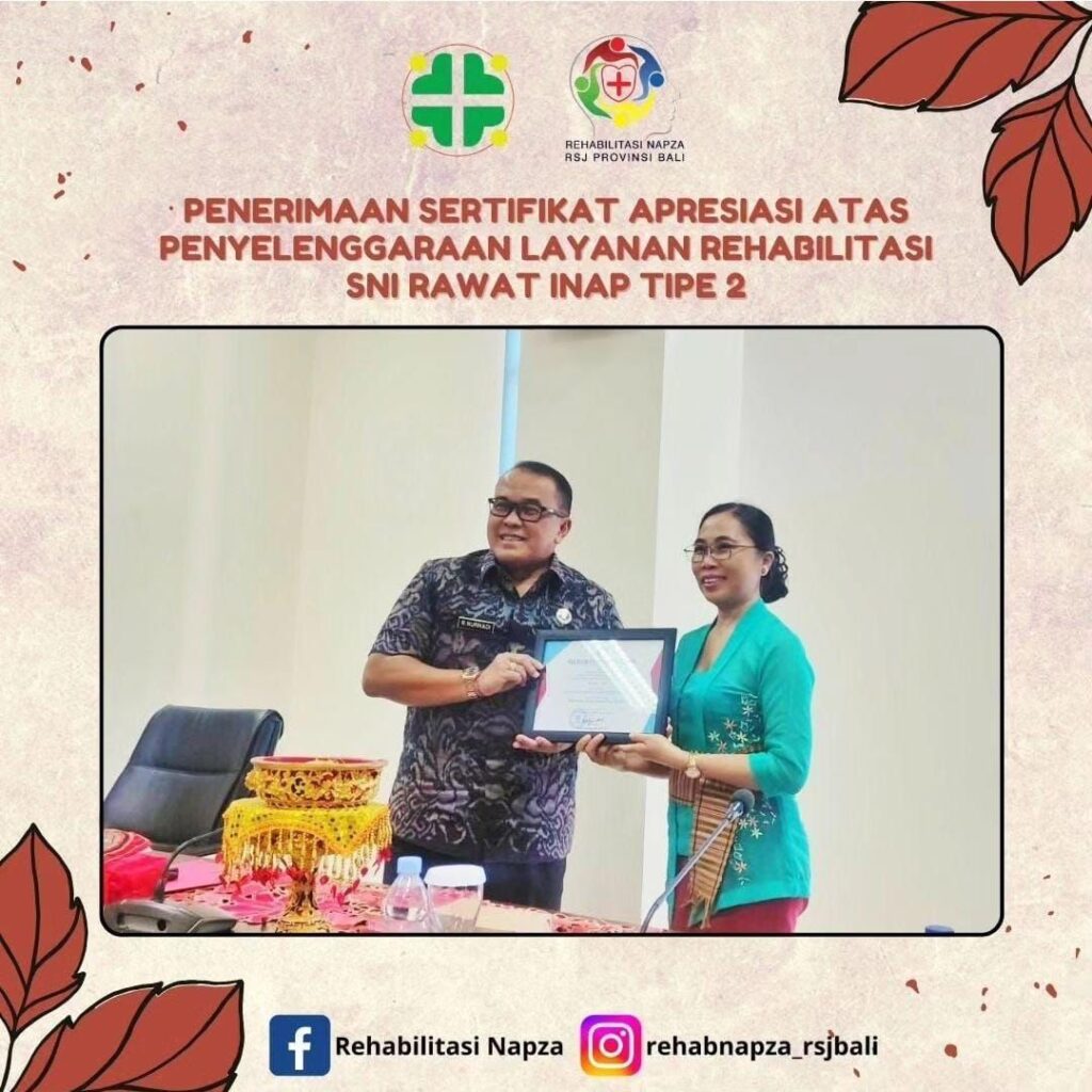 Penerimaan Sertifikat Apresiasi Atas Penyelenggaraan Layanan Rehabilitasi SNI Rawat Inap Tipe 2 Diterima Langsung Direktur Rumah Sakit Jiwa Provinsi Bali
