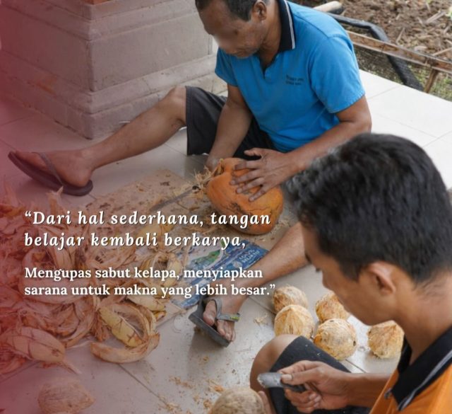 “Dari hal sederhana, tangan belajar kembali berkarya. Mengupas sabut kelapa, menyiapkan sarana untuk makna yang lebih besar.”Aktivitas membersihkan sabut dan batok kelapa ini dilakukan sebagai bagian dari persiapan sarana upacara. Melalui kegiatan sederhana seperti ini, pasien diajak untuk te...
