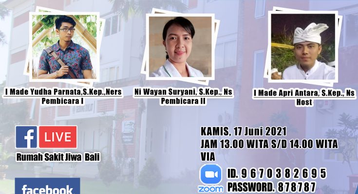 Gema Jiwa Santhi Posted on 15 Juni 2021 by Admin RSJ Gema Jiwa Santhi Tema : DUKUNGAN KESEHATAN JIWA DAN PSIKOSOSIAL COVID-19 UNTUK KELOMPOK RENTAN Kamis, 17 Juni 2021 https://us02web.zoom.us/j/9670382695 … Meeting ID: 967 038 2695 Passcode: 878787