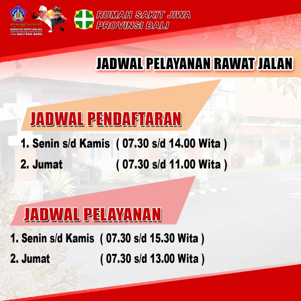 Jadwal Pelayanan Rawat Jalan Rumah Sakit Jiwa Provinsi Bali Posted on 17 Januari 202317 Januari 2023 by Admin RSJ