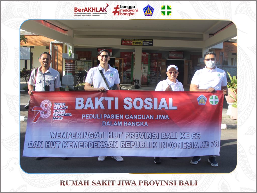Kegiatan bakti sosial “ PEDULI ORANG DENGAN GANGGUAN JIWA (ODGJ) dilaksanakan dalam rangka memperingati Hari Ulang Tahun Provinsi Bali ke-65 dan dan Hari Ulang Tahun Republik Indonesia ke-78. Adapun kegiatan yang dilakukan antara lain sebagai berikut: