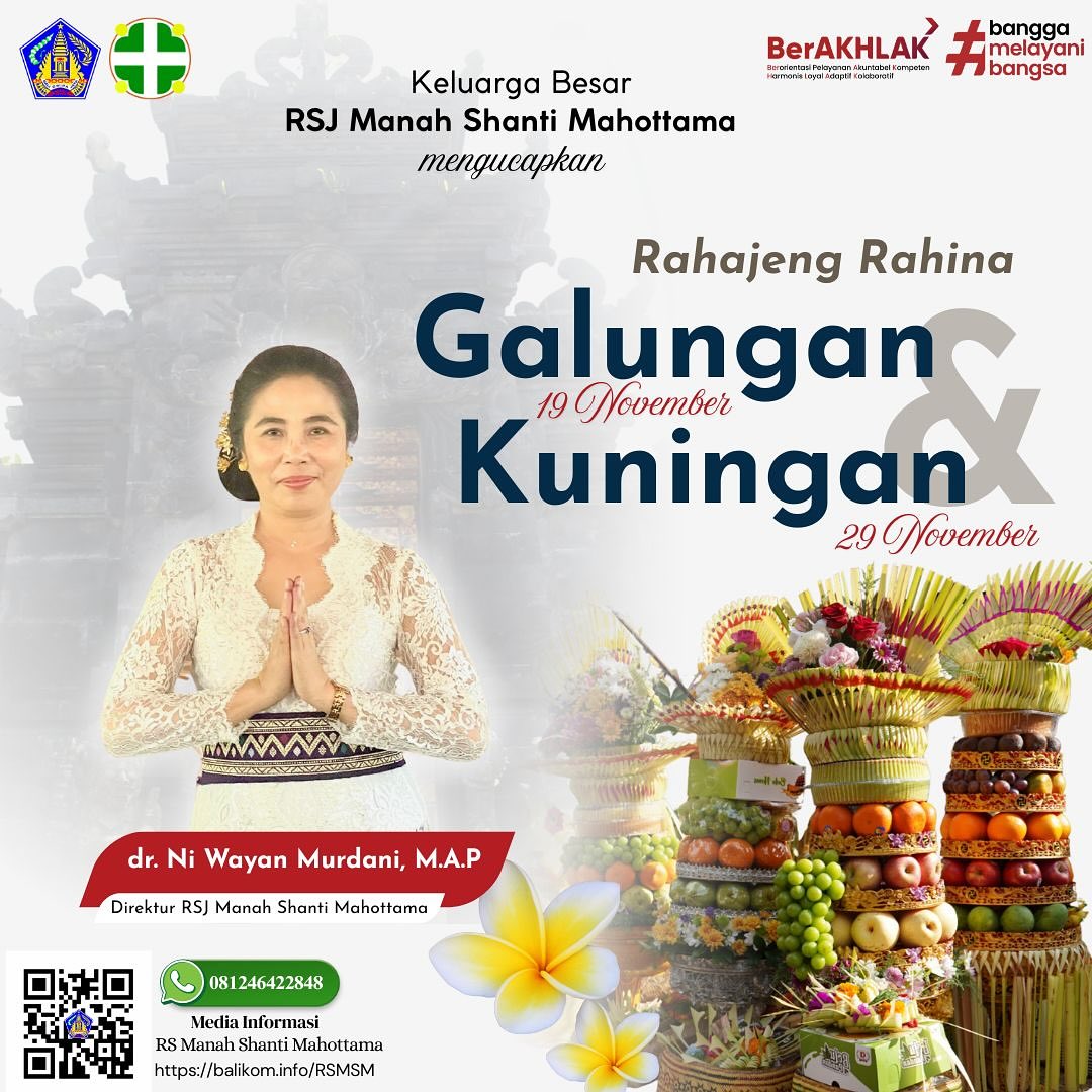Keluarga besar RSJ Manah Shanti Mahottama mengucapkan “Rahajeng Rahuna Galungan&Kuningan” Posted on 19 November 202521 November 2025 by Admin RSJ Keluarga besar RSJ Manah Shanti Mahottama mengucapkan “Rahajeng Rahuna Galungan & Kuningan”Mari rayakan kemenangan Dharma dengan hati penuh syukur, damai, dan semangat menjaga kesehatan jiwa.