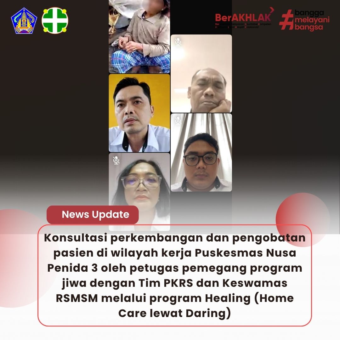Pada hari Rabu, 16 Juli 2025 telah dilaksanakan konsultasi terkait perkembangan dan pengobatan salah satu pasien di wilayah kerja Puskesma Nusa Penida 3 oleh petugas pemegang prog jiwa dengan Tim PKRS dan Keswamas RSMSM melalui program Healing (Home Care lewat Daring) . Dengan program ini petugas dapat menyampaikan kendala yg dihadapi saat kunjungan rumah pada pasien dan mengalami masalah dalam penanganan pasien dan sebaliknya Tim PKRS dan Keswamas dapat memberikan solusi juga edukasi kepada pasien, keluarga juga petugas. Program ini sangat efektif dan efisien dalam membangun komunikasi antar petugas dan juga masyarakat serta menjadi salah satu pilihan sebagai akses komunikasi untuk memberikan layanan yang luas dan terjangkau.
