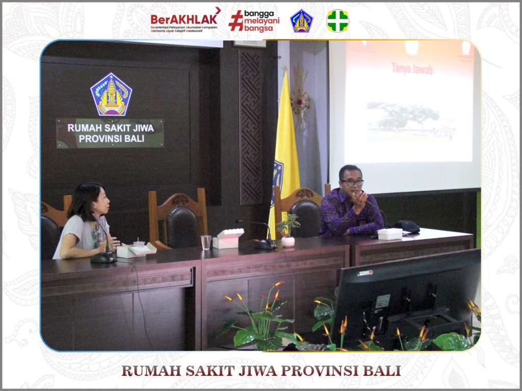 Selasa, tanggal 9 Mei 2021, Rumah Sakit Jiwa Provinsi Bali menerima Kunjungan SPI RSUD Klungkung yang dipimpin oleh ketuanya dr. I Gusti Ayu Kusumawati, M.Biomed. Sp.PA. Kunjungan diterima di Ruang  Pertemuan Lantai 2  oleh Plt. Direktur Rumah Sakit Jiwa Provinsi Bali Dr. I Dewa Gede Basudewa, Sp.KJ dengan didampingi oleh  jajaran management, Ketua SPI Rumah Sakit Jiwa Provinsi Bali beserta anggota. Dalam kunjungan ini di samping bertukar informasi dan pengalaman dalam pelaksanaan kegiatan SPI di masing masing Rumah Sakit , juga dilaksanakan diskusi hangat seputar SPI dan kegiatan diakhiri dengan kunjungan ke ruang SPI untuk  melihat beberapa  dokumen yang ada.