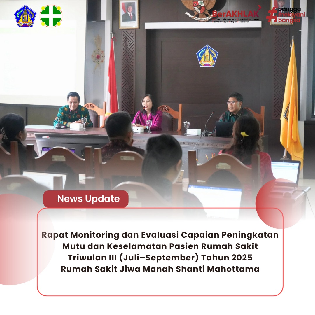 Rumah Sakit Jiwa Manah Shanti Mahottama melaksanakan Rapat Monitoring dan Evaluasi (Monev) Capaian Peningkatan Mutu dan Keselamatan Pasien Triwulan III Tahun 2025 pada Jumat, 14 November 2025. Kegiatan berlangsung di Ruang Pertemuan Lantai 2 dan dihadiri oleh Dewan Pengawas, Direktur, Jajaran Manajemen, Ketua Komite, Kepala unit/instalasi, SPI, KSM, serta seluruh penanggung jawab mutu rumah sakit.