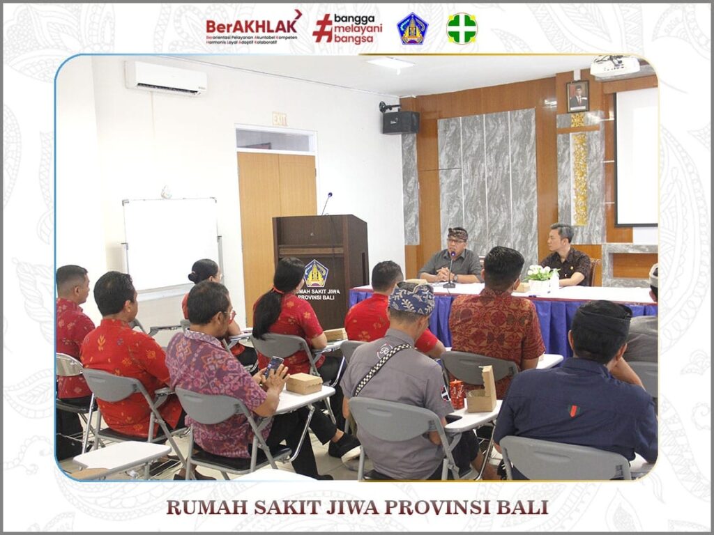 Kamis, 21 Desember 2023 telah dilaksanakan penerimaan magang petugas IPWL dari Rumah Sakit Daerah Mangusada Badung selama 5 hari di Rumah Sakit Jiwa Provinsi Bali dimulai dari tanggal 21 s/d 28 Desember 2023. Acara diterima langsung oleh Wakil Direktur ASD I Gusti Putu Gde Buana Parta, S.Kep. M.Kes bersama jajaran manajemen dan Ka. Ins. Rehab Napza beserta staf yang terkait sebanyak 7 orang. Tujuan magang ini untuk menerapkan administrasi dan penatalaksanaan IPWL di Rumah Sakit Jiwa Provinsi Bali. Acara ditutup dengan pembekalan beberapa materi terkait IPWL sebelum petugas magang akan diorientasiakan ke ruangan.