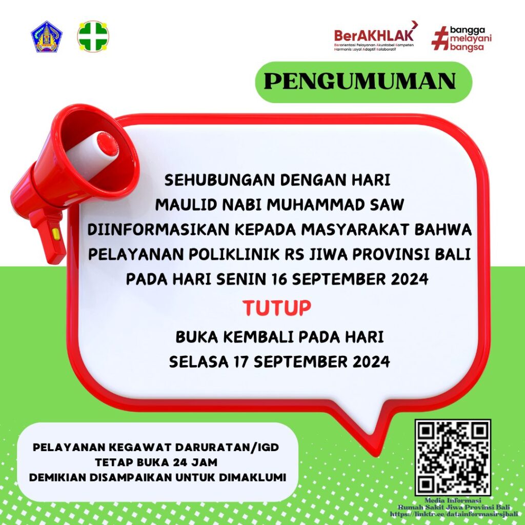 Sehubungan dengan Hari Raya Kuningan dan Hari Raya Nyepi Caka 1946Diinformasikan kepada masyarakat bahwa pelayanan poliklinik Rumah Sakit Jiwa Provinsi