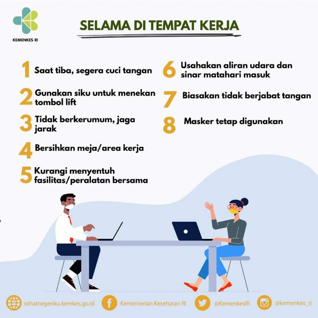 Dengan melaksanakan protokol kesehatan di tempat kerja ,kita terhindar dari penyebaran COVID 19. Berikut yang perlu diperhatikan untuk tetap aman dalam bekerja dan menginspirasi teman yg lain untuk tetap produktif di era NEW NORMAL.
