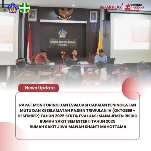 Rumah Sakit Jiwa Manah Shanti Mahottama melaksanakan Rapat Monitoring dan Evaluasi (Monev) Capaian Peningkatan Mutu dan Keselamatan Pasien Triwulan IV (Oktober–Desember) dan evaluasi Manajemen Risiko semester II Tahun 2025 sebagai bagian dari komitmen berkelanjutan dalam meningkatkan kualitas layanan serta menjamin keselamatan pasien.
