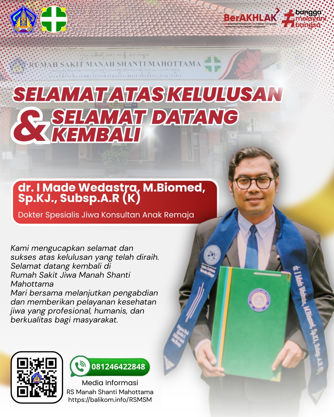 Keluarga besar Rumah Sakit Jiwa Manah Shanti Mahottama mengucapkan selamat dan sukses atas pencapaian yang telah diraih. Perjalanan belajar, dedikasi, dan kerja keras akhirnya membuahkan hasil yang membanggakan.