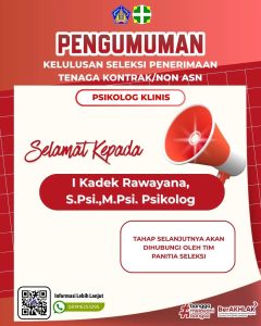 Selamat kepada I Kadek Rawayana, S.Psi., M.Psi., Psikolog atas kelulusannya dalam Seleksi Penerimaan Tenaga Kontrak/Non ASN sebagai Psikolog Klinis.