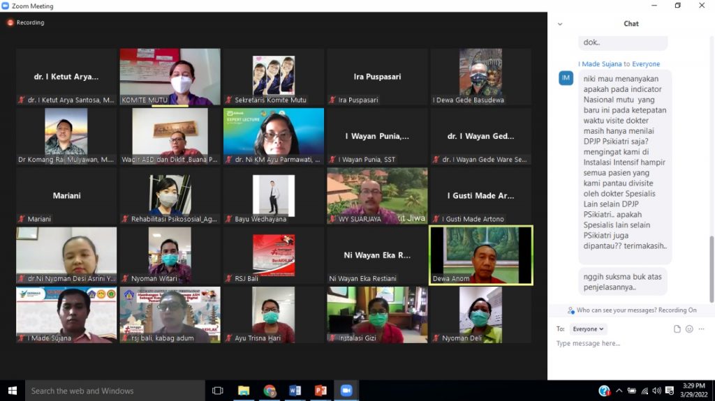 Sosialisasi Indikator Nasional Mutu (INM) Rumah Sakit dilaksanakan pada hari Selasa, 29 Maret 2022 dibuka oleh Plt Direktur Rumah Sakit Jiwa dan diikuti oleh jajaran management, Ketua Komite,Kepala Instalasi / Unit dan PIC. asesor internal,dan anggota komite mutu.Ketua Komite Mutu , Luh Gede Parwati menyampaikan bahwa ada beberapa Profil Indikator Nasional Mutu Rumah Sakit yang berubah sehingga sangat perlu untuk diketahui bersama dan menjadi acuan dalam pengukuran, pelaporan dan evaluasi capaian Indikator Nasional Mutu di Rumah Sakit Jiwa nantinya