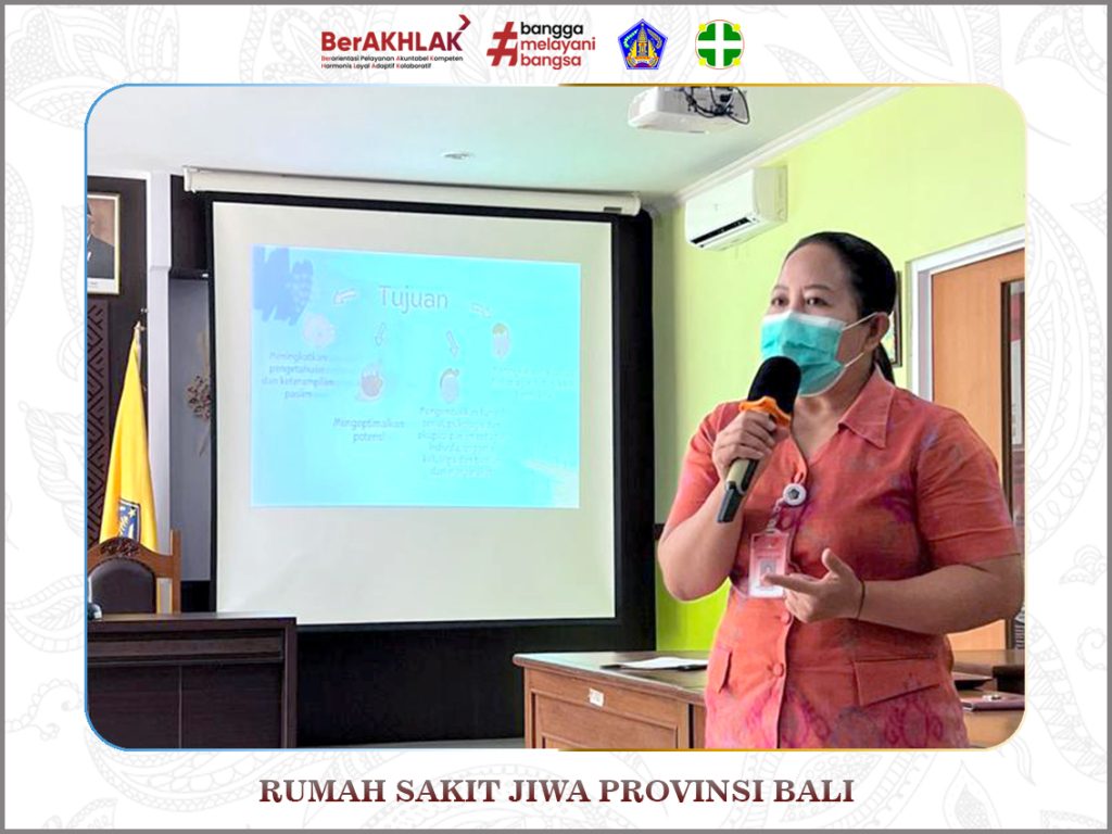 Selasa 11 Juli 2023 bertempat di Ruang Pertemuan lantai 2 Rumah Sakit Jiwa Provinsi Bali telah hadir Tim Penyuluh Kantor Kementrian Agama Kabupaten Bangli yang diterima oleh Wadir ASD Rumah Sakit Jiwa Provinsi Bali beserta para Tim Pendamping sekaligus sebagai Pemateri Orientasi Umum untuk  peserta Orientasi Penguatan pelaksanaan dan pendampingan Kerohanian bagi penyuluh  dalam mendampingi pasien di Rumah Sakit Jiwa Provinsi Bali . Dalam kegiatan orientasi ini peserta mendapatkan informasi terkait Profile Rumah Sakit Jiwa Provinsi Bali, PPI,PMKP K3RS , Basic Life Support dan ditutup dengan kunjungan ke Ruang Rehabilitasi Psikososial.